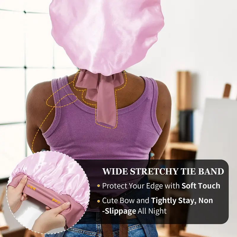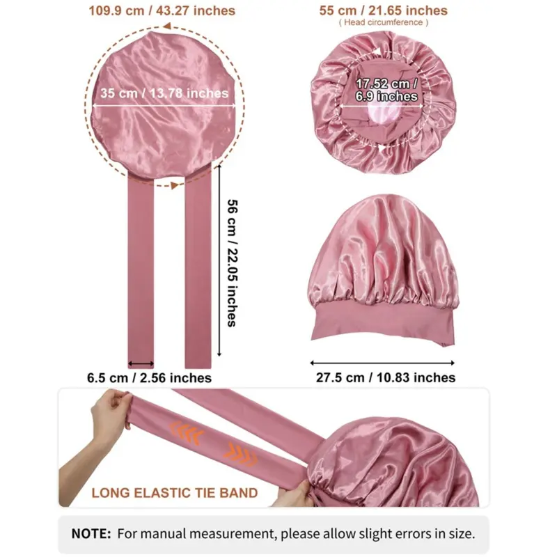 【One size fits all】Our oversized hair cap is elastic and has a long soft strap, which you can adjust according to your head circumference. The adjustable long strap will not bring extra burden to your head, it can better secure the satin bonnet, and it will not slip off your head when you sleep all night